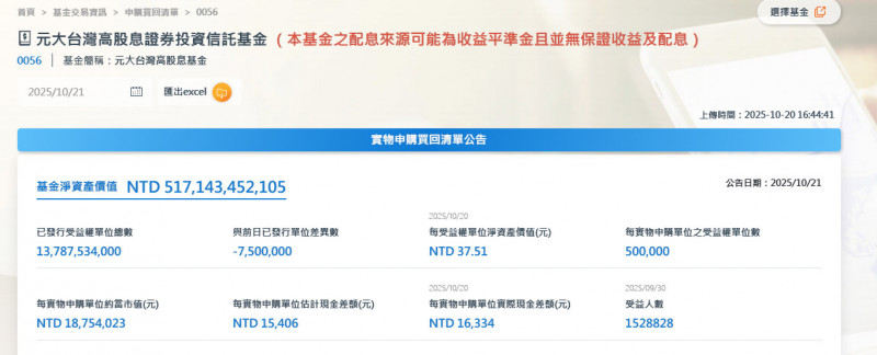 觀察0056於9月30日帳上包含股息收入的每單位可分配的收益為5.15元、以及資本利得的資本平準金6.77元,第三季以來分別成長5.7%、47.5%,去年全年每單位配息3.63元,今年全年配息達3.87元,比去年更高,寫下歷史新高紀錄。