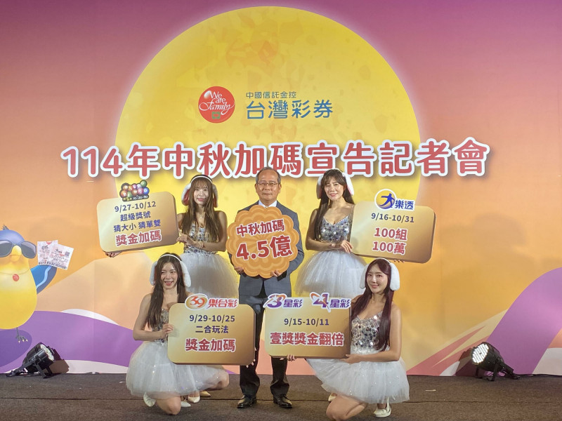台彩中秋加碼4.5億元,自9月15日起3星彩及4星彩連續24期壹獎獎金翻倍;9月16日起大樂透加開100組100萬元;9月27日起連續16天「BINGO BINGO賓果賓果」的「超級獎號」、「猜大小」、「猜單雙」玩法獎金加碼;39樂合彩也自9月29日起連續24期「二合」玩法單注獎金提高至1500元。