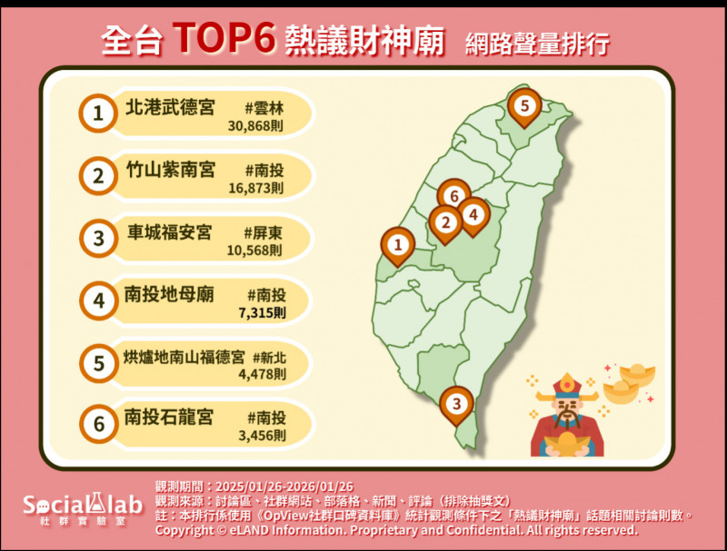 〔記者歐宇祥/台北報導〕農曆新年將至,AI軟體服務廠商意藍資訊(6925)旗下的「Social Lab社群實驗室」今日透過社群口碑資料庫,追蹤近一年「熱議財神廟」排行,發現第一名就是雲林「北港武德宮」。