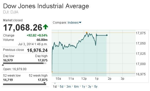 美國道瓊工業指數日前突破17,000點,推升四大科技類股股價攀升,讓在台的供應鏈廠也因而沾光。(圖擷取自marketwatch)