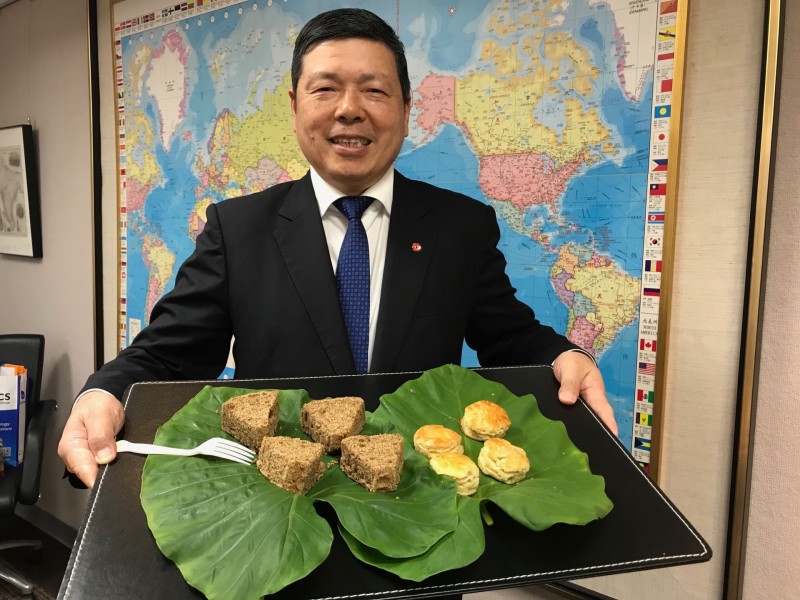 貿協秘書長葉明水宣佈9月將舉辦首屆循環經濟展,並展示利用剩餘食材製作的糕點。(實習記者畢翔攝)