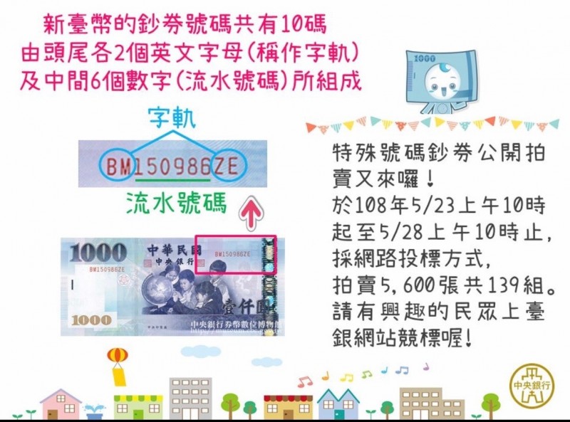 央行指出,各面額新台幣鈔券都是由頭尾各2個英文字母(稱作字軌)及中間6個數字(流水號碼)共10碼所組成。流水號碼為自000001到999999,故同組字軌共有999,999張,其中包含「888」、「168」諧音為「發發發」、「一路發」等民眾視為吉利的數字,還有連號等特殊意義又具收藏價值的特殊號碼。