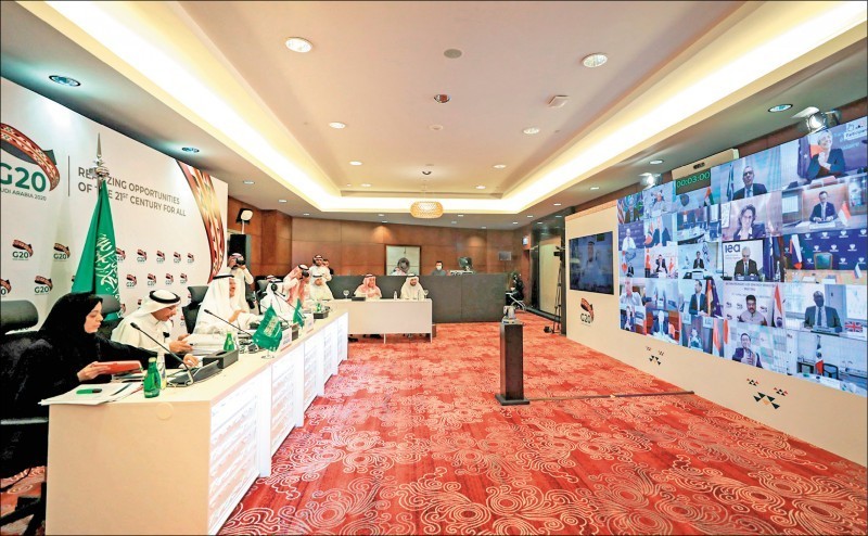 沙烏地阿拉伯能源部長阿卜杜拉齊茲親王(左三)十日在利雅德主持二十國集團(G20)能源部長視訊會議。(法新社)