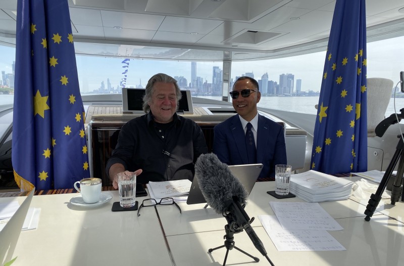郭文貴(右)、前白宮首席策士班農(左)於6月4日宣佈成立「新中國聯邦」,號召中國人民推翻中共。(圖擷自GTV網站)