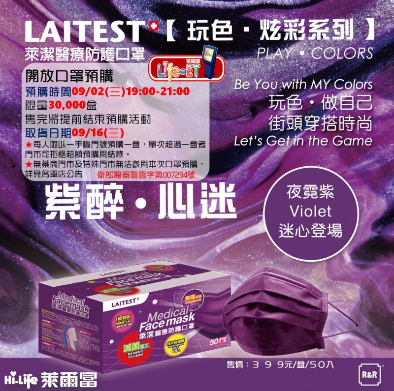 防疫期間時尚色口罩一上市皆秒殺,民眾瘋搶特殊色口罩,萊爾富「玩色、炫彩」系列口罩,下一波主打「紫醉、心迷」的「夜霓紫」色口罩,運用霓光般的紫色融合醫療口罩,更添神秘。