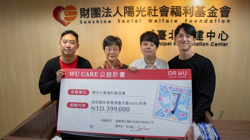 DR.WU年度代言人吳慷仁(右一)、生命鬥士莊雅菁(右二)與DR.WU 董事長吳奕叡(左一)更一同現身陽光基金會,將千支護手霜所得100%捐贈陽光社會福利基金會。(圖:DR.WU)