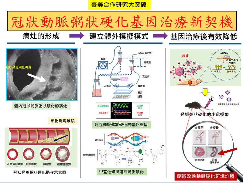 而本次臺美合作研究團隊針對血管內皮「信使核糖核酸(mRNA)甲基化」研究,利用生物工程模擬冠狀粥狀動脈硬化的過程,並在冠狀粥狀動脈硬化的臨床檢體中成功證實: 信使核糖核酸(mRNA)甲基化在冠狀動脈粥狀硬化過程中扮演極重要的致病機轉;更進一步運用信使核糖核酸(mRNA)基因療法,不僅可以有效抑制動脈粥狀硬化之相關發炎,並且在活體動物實驗證實可明顯減少動脈硬化斑塊堆積,以及有效改善粥狀動脈硬化的生成!