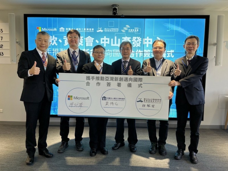 中山大學產發中心、資策會、微軟今(22日)共同簽署MOU加速推動亞灣科技新創。圖左起為台灣微軟公司總經理陳仲儒、高雄市副市長羅達生、經濟部中小企業處主秘謝戎峰、中山大學校長鄭英耀、資策會副執行長蕭博仁、中山大學產發中心主任林根煌。(中山大學提供)