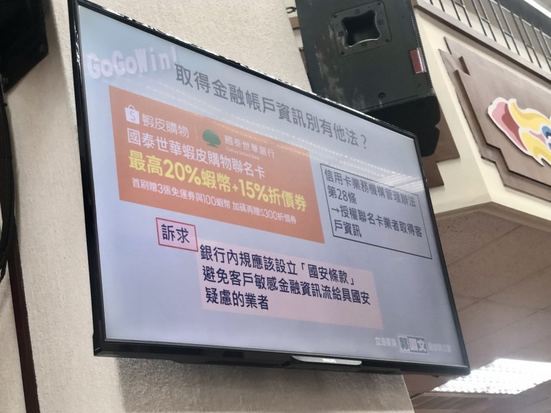郭國文質詢指出,因為蝦皮購物的規模越來越大,大家都會有疑慮,尤其,國泰世華銀行發行蝦皮聯名卡,他擔心,是否會有客戶的授權資料,流向有中資疑慮的企業(指蝦皮)。我們洽詢過國泰世華,他們回應「袂、袂」(台語,不會),但我們擔心是「賣、賣」(台語,發音相同),把資料賣掉。