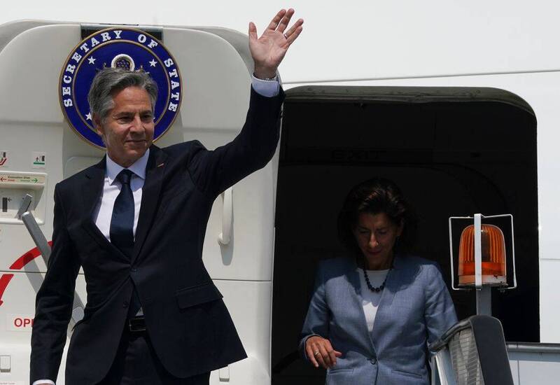 美國國務卿布林肯(左)和商務部長雷蒙多一起抵達墨西哥,商討半導體合作計畫。(美聯社)