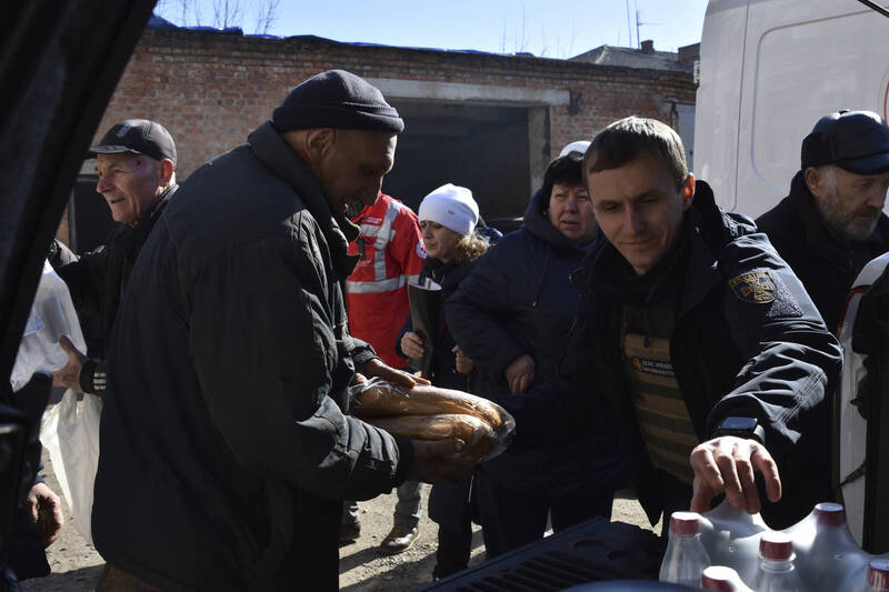 志工發放物資給烏克蘭民眾。(美聯社)