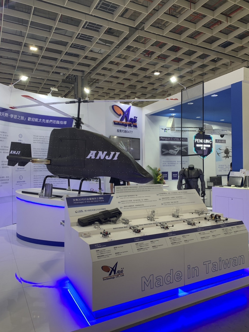 太陽能模組廠安集(6477)首次參加「台北國際航太暨國防工業展」,現場展出大型無人載具,可載重100公斤,飛行3小時,預計2年內開發完成。 (記者張慧雯攝)