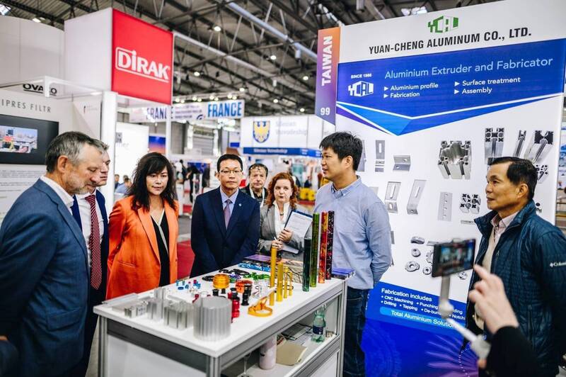 參展企業遠丞鋁業向捷克代表處經濟組組長劉若斐(左3)、貿協華沙台貿中心主任吳春見(左4)與捷克貴賓介紹產品。(貿協提供)