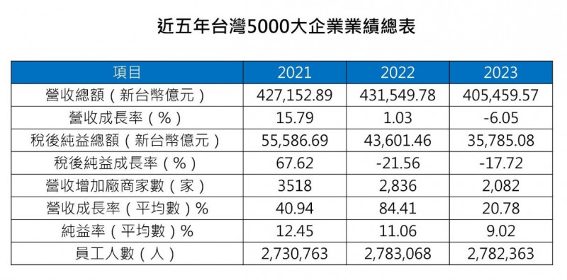 根據CRIF中華徵信所最新出版的「2024台灣大型企業排名TOP5000」結果顯示,2023年5000大企業的營收總額中斷前兩年續創歷史新高的走勢,稅後純益總額則連續兩年獲利衰退,顯示這一波全球產業供應鏈高庫存調整期間,對5000大企業造成的影響很可觀。
