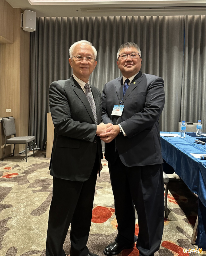 銀行公會推舉新任理事長為兆豐金董事長董瑞斌(左)與先前的代理理事長、合庫金控董事長林衍茂合照。(記者陳梅英攝)