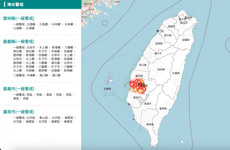 一級淹水警戒區域包括雲林縣北港鎮 、元長鄉 、水林鄉 、口湖鄉,嘉義縣太保市、水上鄉 、新港鄉 、六腳鄉 、東石鄉 、朴子市 、布袋鎮 、民雄鄉 、鹿草鄉 ,嘉義市東區、西區,台南市白河區 、東山區、白河區 、後壁區 。