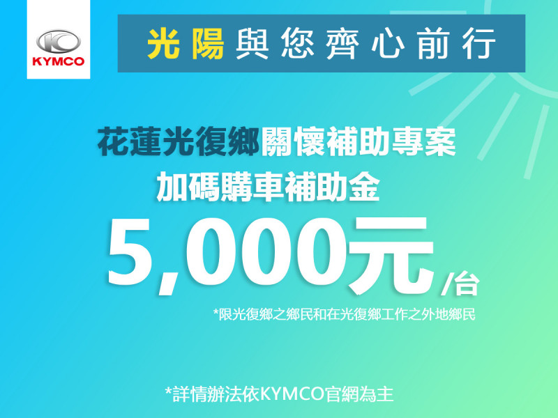 〔記者楊雅民/台北報導〕花蓮光復鄉遭洪災重創,光陽(KYMCO)機車啟動「花蓮光復鄉洪災」受災戶重建家園補助購車方案,凡設籍於花蓮縣光復鄉的鄉民,以及在光復鄉工作之外地鄉民(需提供工作證或工作證明),9月25日起至10月31日止在花蓮購車完成領牌,除原有促銷專案之外,將加碼購車補助金每台5000元。