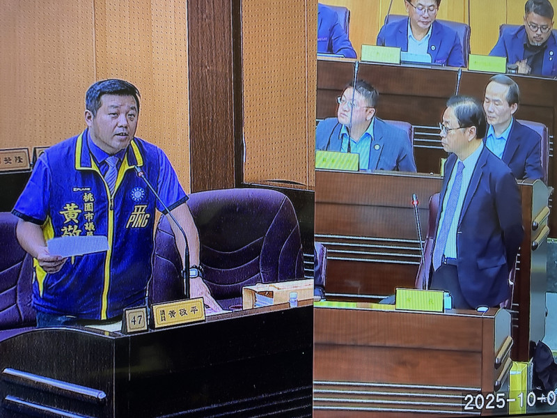 市議員黃敬平質詢市長張善政,對爭取輝達落腳桃園的後續。(記者謝武雄翻攝)