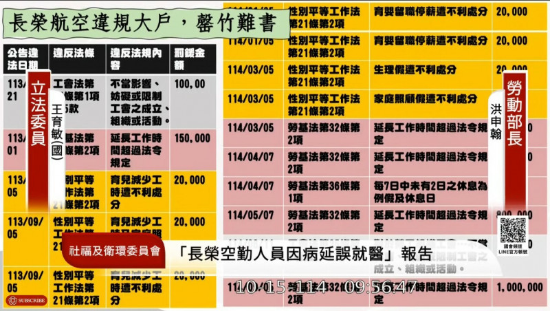 王育敏羅列長榮航空過去幾年的違規紀錄,歸納長榮航空的違規可分為兩大類型,1是勞基法跟工會法,另外是性別平等工作法,質疑長榮的高違規頻率,包括數件因育兒減少工時遭不利處分,今年也有育嬰留職停薪遭到不利處分、請生理假遭到不利處分,連家庭照顧假也遭到不利處分,但每一案都只被罰2萬元,對照一個營業額每年高達上百億的企業,根本不痛不癢、完全不會發揮任何裁罰效果。