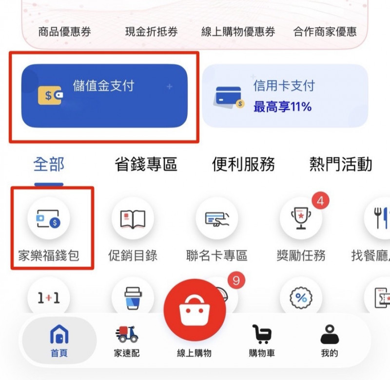 政府普發1萬現金今天開始上線登記,家樂福啟動限時「錢包放大術」活動,自11月12 日至12月11日止,只要儲值1萬元於家樂福app內「家樂福錢包」,儲值滿1萬元,即可獲得10%回饋金(等同1000 元)。(家樂福提供)