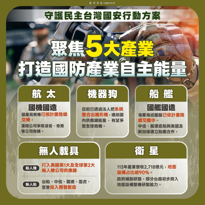 〔記者廖家寧/台北報導〕為打造國防關鍵產業自主能量與量能,經濟部推動軍工重點產業,聚焦無人載具、航太、船艦、機器狗、衛星等五大產業。