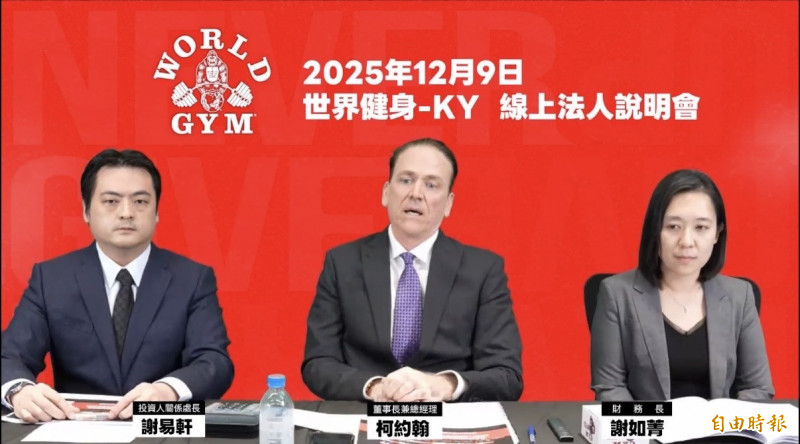 世界健身-KY(2762)今天召開法說會,世界健身-KY會董事長柯約翰(中)表示,明年全球將新增40~50間據點,其中10~15家為直營店,並插旗泰國市場,泰國將採直營模式,初期先開2家直營店,泰國也為2026年海外布局的一大驅動引擎。(記者楊雅民攝)