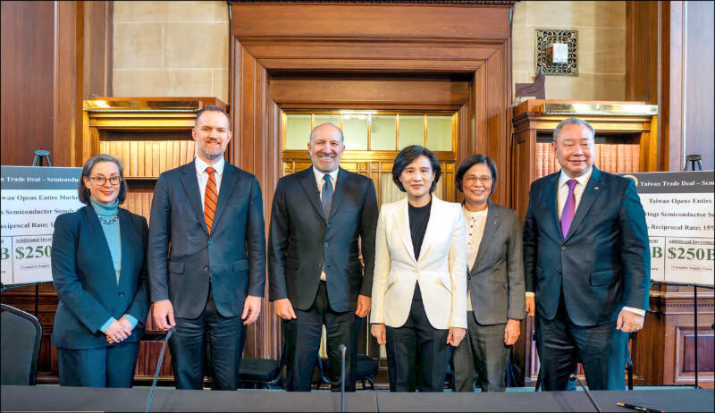 台美關稅敲定,簽署MOU後合影;左起為AIT執行理事藍鶯、美國貿易代表葛里爾、美國商務部長盧特尼克、行政院副院長鄭麗君、行政院政委楊珍妮、駐美代表俞大㵢。(取自盧特尼克社群X)