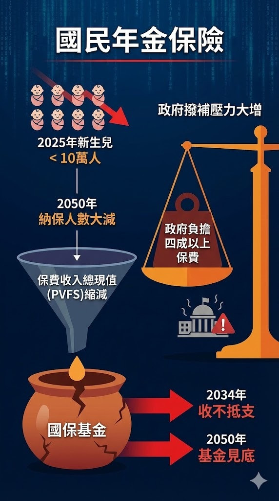 〔記者高嘉和/台北報導〕不只勞保!開辦僅17年的國民年金保險預估2034年將收不抵支、2050年基金見底。因國保財務精算也採「開放團體模型」,評估未來40年的新進人員,因2025年新生兒快跌破10萬人大關,這群小孩將在25年後(2050年)符合納保資格,當人數大減,保費收入總現值(PVFS)也將縮減,國保收支勢必加速惡化,而政府負擔4成以上保費,未來撥補壓力也將大增。