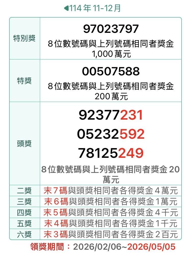 〔記者鄭琪芳/台北報導〕快來對獎!去年11-12月期統一發票今天開獎,1000萬元特別獎中獎號碼為「97023797」;200萬元特獎中獎號碼為「000507588」。財政部賦稅署表示,去年11-12月期統一發票,領獎期限為今年2月6日至5月5日,提醒中獎人應於領獎期限內領獎,逾期將無法兌領。