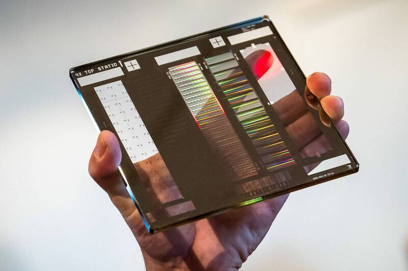 全球晶片製造商四分之一的資本支出用於曝光技術,其中大部分流向了ASML。圖為ASML公司總部展示一個極紫外線(EUV)光罩玻璃母版。(彭博)