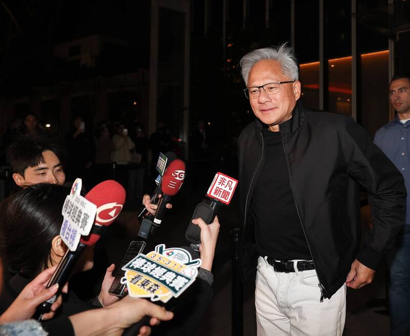 輝達執行長黃仁勳(右)29日搭機抵台,晚間與台積電創辦人張忠謀在台北市松山區餐廳聚餐,步出餐廳接受現場媒體訪問。(中央社)