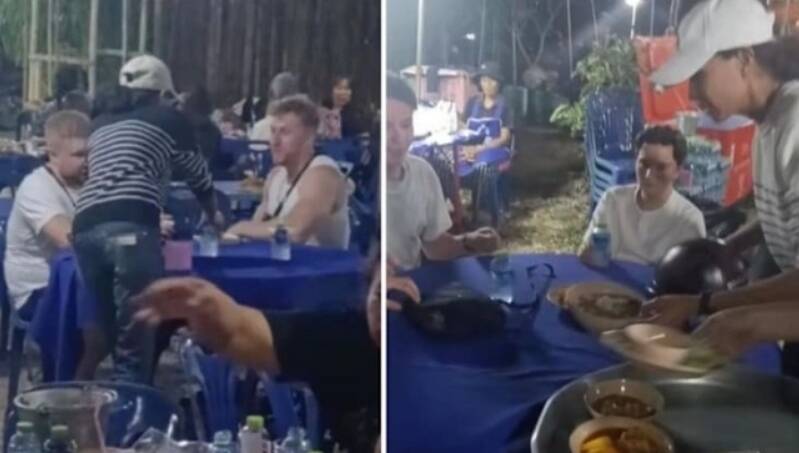影片片段中,兩名西方男子坐在為葬禮賓客準備的桌子旁,一名泰國女子為他們端來飲用水。
