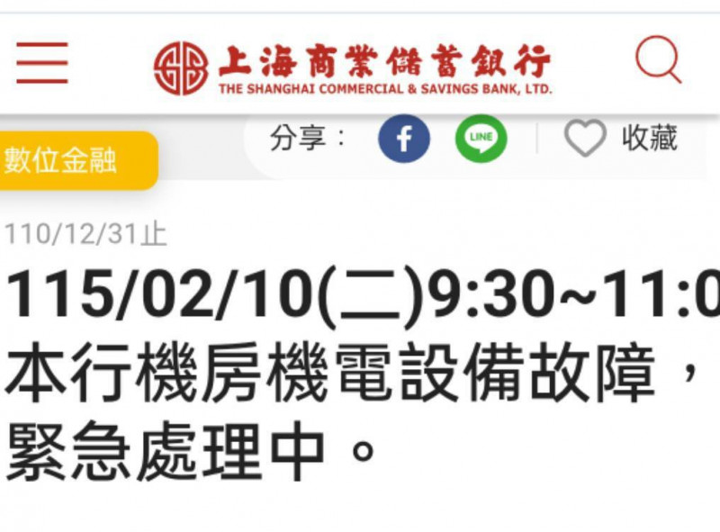 不過,今日上海商銀卻發生嚴重當機事件,根據該行的公告,發生當機的原因是「機房機電設備故障」,正緊急處理中。