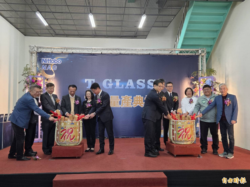 T-Glass量產典禮今在民雄工業區福隆公司舉行,日東紡集團電子材料事業本部長林寿信攜手福隆公司董事長川崎哲哉主持,2人與嘉義縣長翁章梁、經濟部投資促進司副司長呂貞慧、立委蔡易餘、義雲會會友等人,用木槌敲開圓形酒桶蓋子,完成鏡開儀式祈福。