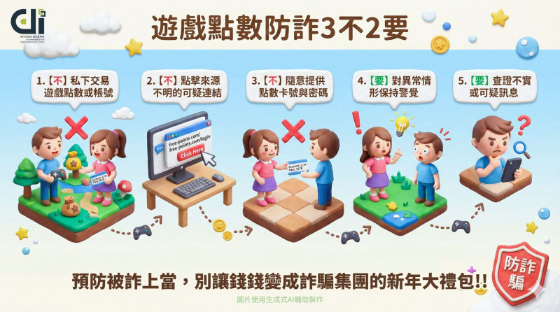為協助民眾提高警覺,數產署提出「3不2要」防詐心法,包括:不私下交易遊戲點數或帳號、不點擊來源不明的可疑連結、不隨意提供點數卡號與密碼;同時要對異常狀況保持警覺、要查證任何可疑或不實訊息,以降低受騙風險。