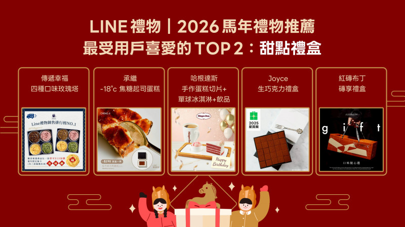 整體趨勢顯示,在LINE禮物熱門品類排名中,甜點禮盒穩居第二,僅次於具吉祥寓意的「好運意義」類型,領先美妝保養、開運小物與香水香氛等品項。品牌辨識度高、外觀設計精緻且具視覺美感的禮盒,於春節期間展現出更強吸引力,尤其在商務送禮情境中,更被視為安全且得體的首選。