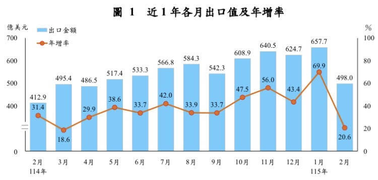 〔記者鄭琪芳/台北報導〕財政部今公布2月出口498億美元、為歷年同月最高,月減24.3%,因適逢春節工作天數減少,但2月出口仍年增20.6%、連續28個月正成長;累計1至2月出口1155.7億美元、創歷年同期最高,年增44.5%。財政部表示,2月工作天數只有14天,為2011年以來最少,但出口仍為歷年同月最佳,再次印證出口動能強勁,預料3月出口639億至667億美元、年增29%至35%,單月出口600億美元以上將成新常態,第1季出口創歷年次高十拿九穩。