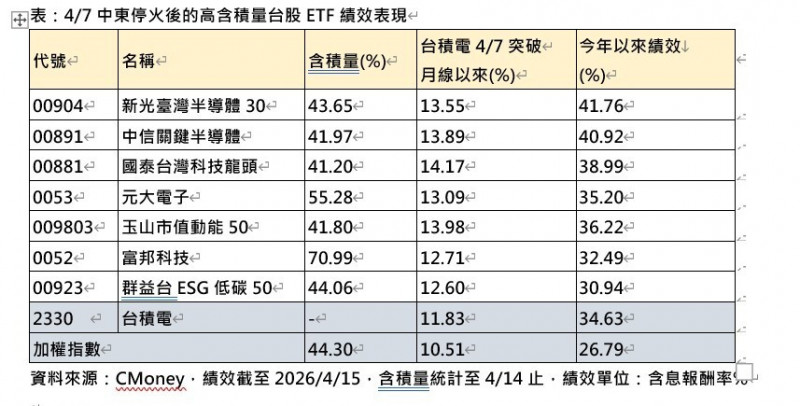 〔記者王孟倫/台北報導〕根據統計,自4月7日川普宣布中東停火後,台積電的股價、隨即展開強勢攻勢,一路走高。在4月16日法說會前夕,股價更頻創歷史新高、持續刷新天際線。法人指出,觀察本波走勢,台積電明顯自4月7日啟動漲勢,截至4月15日止,累計漲幅已逾11%,並帶動持股比重逾四成的高含積量台股ETF,同步上揚。