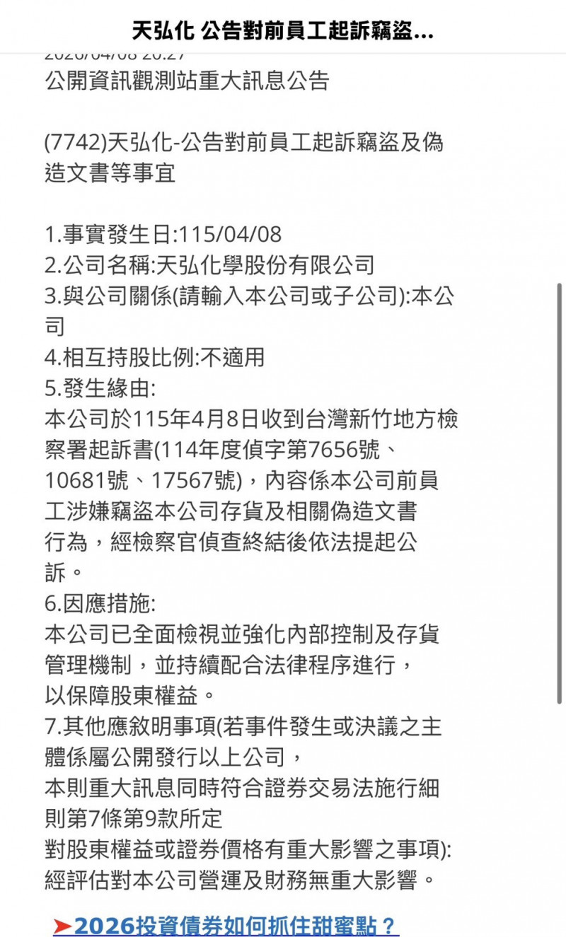 他們發布的重訊內容表示,他們自今年4月8日收到新竹地方檢察署針對前員工陳志華、張宏昱的起訴書,起訴內容是天弘化公司前員工涉嫌竊盜他們公司存貨和相關偽造文書的行為。
