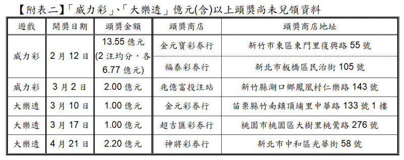 台彩表示,今年2月12日開出的威力彩頭獎13.55億元,2位中獎人尚未兌領。(台彩提供)