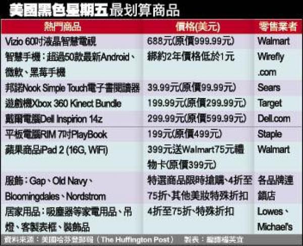 美國黑色星期五最划算商品。(記者楊芙宜製表)