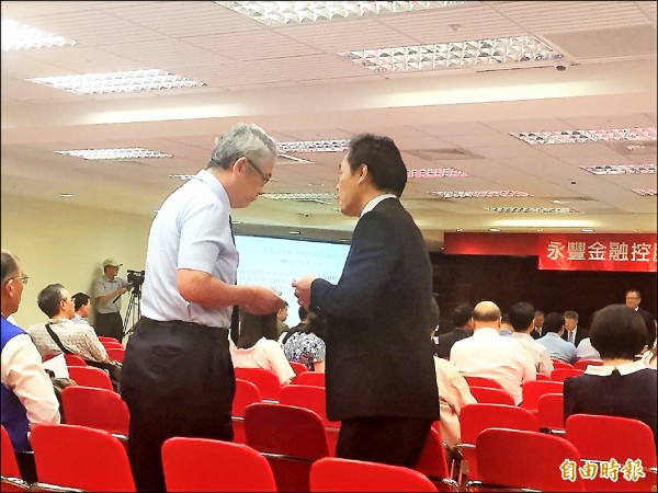 永豐金工會理事長鍾馥吉(左)在股東會發言完畢後,坐在後方的寶佳資產發言人周伯鍾(右),隨即上前與鍾馥吉交換名片。(記者王孟倫攝)