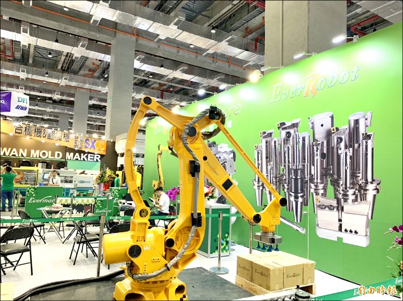 機械、工具機產業受貿易戰衝擊,無薪假情況嚴峻,公會喊話勞動部提撥就業安定基金救火。圖為台北國際自動化大展廠商展出機械手臂。(記者林菁樺攝)機械、工具機產業受貿易戰衝擊,無薪假情況嚴峻,公會喊話勞動部提撥就業安定基金救火。圖為台北國際自動化大展廠商展出機械手臂。(記者林菁樺攝)