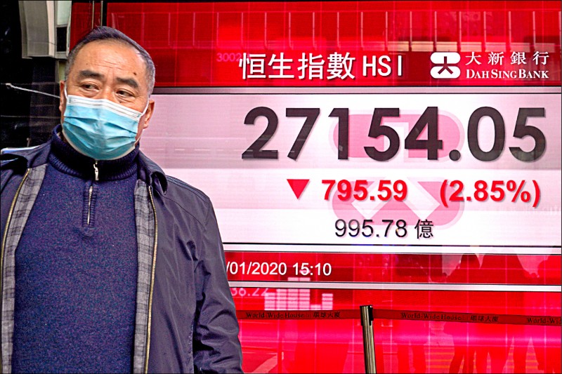 中國武漢肺炎疫情延燒衝擊,港股昨春節後開市狂洩近800點。(美聯社)中國武漢肺炎疫情延燒衝擊,港股昨春節後開市狂洩近800點。(美聯社)