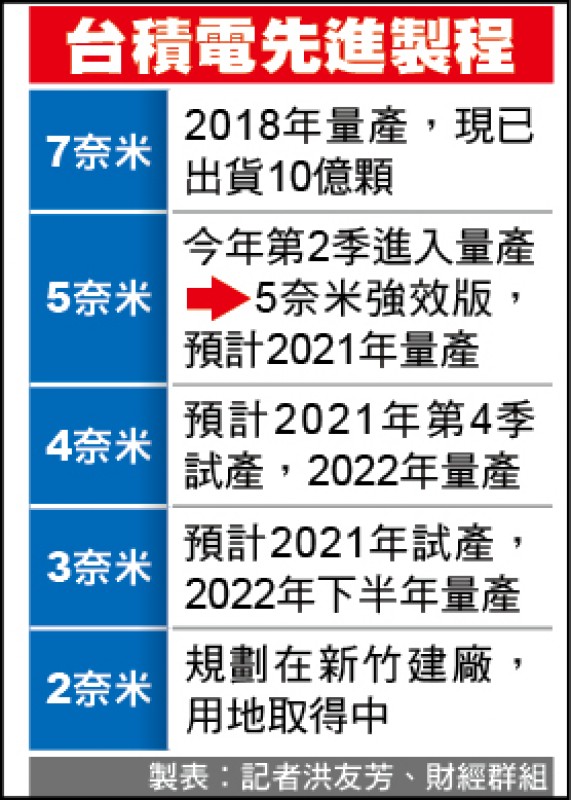 〔記者洪友芳/新竹報導〕台積電總裁魏哲家昨表示,台積電正在南科量產的五奈米是全球業界最先進的製程技術,強化版五奈米預計二○二一年提前量產,三奈米將於明年試產、二○二二年下半年量產。業界人士認為,台積電在五奈米與三奈米兩大先進製程持續領先三星。