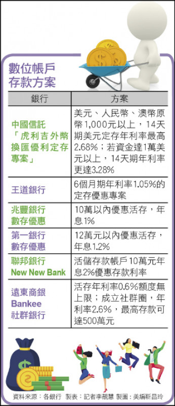 事實上,民眾如果偏好台幣存款,就更該好好利用銀行的數位存款帳戶,例如兆豐銀行、第一銀行、聯邦銀行,均積極經營數位存款業務,提供存戶一定金額內的優惠活儲利率。兆豐銀、一銀的既有數存客戶,每月無條件分別有10萬、12萬元的優惠活存,年息分別為1%、1.2%;聯邦銀行的New New Bank,每月更提供活儲存款帳戶10萬元的年息2%優惠存款利率,還有美元等12種外幣換匯優惠,民眾不妨選擇偏好的往來銀行,嘗試數位帳戶的便利性。