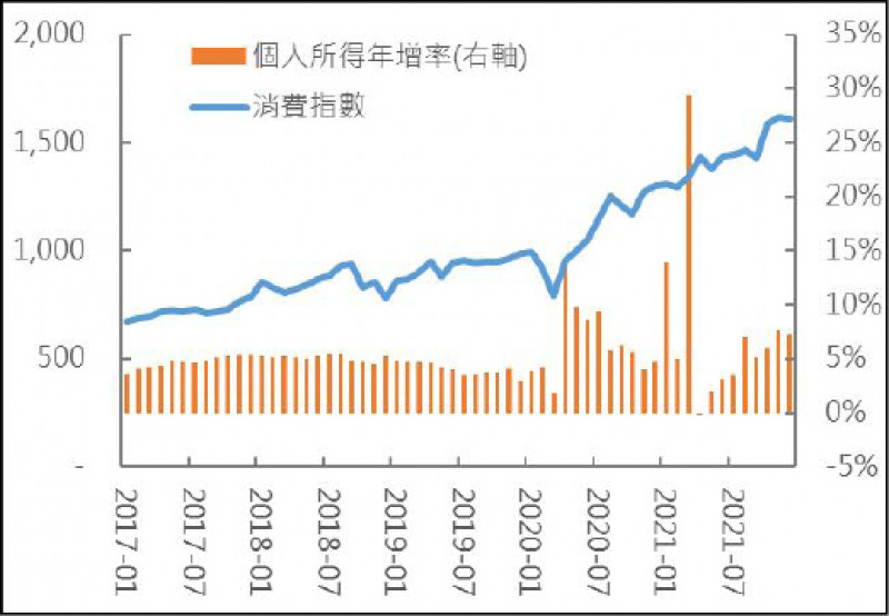 2022年1月美國CPI休閒娛樂服務支出指數在去年11及12月連續回落後,開始出現上升,顯示疫情和緩與解封下,休閒娛樂等服務性支出開始增加。疫情衝擊就業市場,使產業出現缺工問題,但疫情逐漸緩解與薪資提高之下,將有助緩解缺工問題。美國今年1月非農業就業人口意外大增46.7萬人,遠高於市場預期的15萬人。美國1月失業率為4%,1月平均時薪較去年同期大漲5.68%、月增0.73%,高於市場預期的年增5.1%、月增0.5%,顯示企業雇主持續提高薪資招聘人才。2021年12月個人所得年增率7.28%,高於過去10年平均的4.82%。根據統計,個人所得年增率高於平均值時,消費指數均呈現攀升。