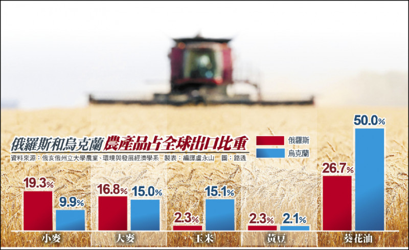 俄國及烏克蘭是全球穀物重要供應國,根據美國俄亥俄州立大學最新研究,兩國合計占全球小麥和大麥出口各約三成,玉米逾十七%,葵花油超過七成五。