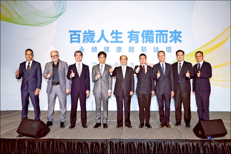 南山人壽盛大舉行永續健康趨勢論壇,左起為南山人壽總經理范文偉、倫敦商學院經濟學教授Andrew J.Scott、南山人壽董事長尹崇堯、金管會主委彭金隆、前立法院長王金平、衛福部政務次長呂建德、今周刊發行人梁永煌、關渡醫院院長陳亮恭、今周刊研發長王之杰等。(南山人壽提供)
