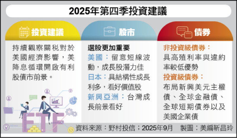 野村投信投資長陳致洲表示,第四季投資人最大的課題正是「追求風險(Risk on)」或「風險趨避(Risk off)」,由於關稅上升對美國經濟的影響將逐漸浮現,美國政府債務持續增加,對於企業獲利、經濟成長以及美國降息步調的預測,使得追求風險還是趨避風險的爭辯不斷。